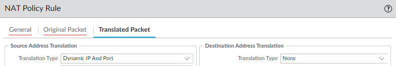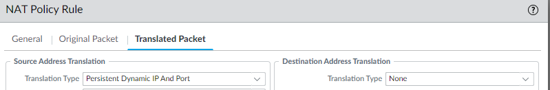 - For the Translated Packet, in Source Address Translation, for regular DIPP, for Translation Type, select Dynamic IP and Port. For persistent DIPP in PAN-OS 11.0 and earlier releases, select Dynamic IP and Port. For persistent DIPP in releases after PAN-OS 11.0, select Persistent Dynamic IP and Port.