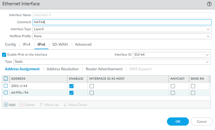 - Select NetworkInterfaces and select the interface that performs NAT.Select the IPv6 tab.Select Enable IPv6 address on interface.Add your private IPv6 prefix.Add the well-known prefix 64:ff9b::/96.Click OK.