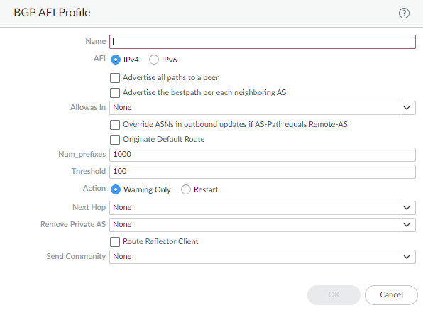 Set the Keep Alive Interval (sec)—the interval, in seconds, after which routes from the peer are suppressed according to the Hold Time setting (range is 0 to 1,200; default is 30).Set the Hold Time (sec)—the length of time, in seconds, that may elapse between successive Keepalive or Update messages from the peer before the peer connection is closed (range is 3 to 3,600; default is 90).Set the Minimum Route Advertise Interval (sec)—the minimum amount of time, in seconds, between two successive Update messages that a BGP speaker (the firewall) sends to a BGP peer that advertise routes or withdrawal of routes (range is 1 to 600; default is 30).Click OK.Create a BGP Address Family Identifier (AFI) profile to apply to a BGP peer group or peer.- Select NetworkRoutingRouting ProfilesBGP.Add an AFI Profile by Name (a maximum of 31 characters).
