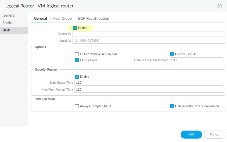 For Path Selection, enable Always Compare MED to choose paths from neighbors in different autonomous systems; default is disabled. The Multi-Exit Discriminator (MED) is an external metric that lets neighbors know about the preferred path into an AS. A lower value is preferred over a higher value.Enable the Deterministic MED Comparison to choose between routes that are advertised by IBGP peers (BGP peers in the same AS). Default is enabled.Click OK to save general BGP settings.Configure a BGP peer group.- Select NetworkRoutingLogical Routers and select the logical router.Select BGPPeer Group and Add a peer group by Name.Enable the peer group.Specify the peer group Type as IBGP (Internal BGP—peering within an AS) or EBGP (External BGP—peering between two autonomous systems).For AFI IP Unicast, select or create an AFI Profile (Create a BGP Address Family Identifier profile) to apply the settings in the profile to the peer group. The default is None.For AFI IPv6 Unicast, select or create an AFI Profile (Create a BGP Address Family Identifier profile) to apply the settings in the profile to the peer group. The default is None.
