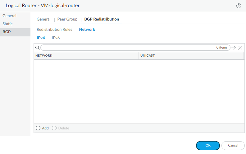 Select Network to advertise routes based on a network address.- Select IPv4 or IPv6 and Add a corresponding Network address; subnets with matching network addresses are advertised to BGP peers of the logical router.