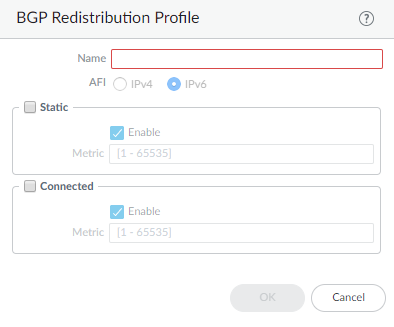 Select IPv4 or IPv6 AFI to indicate the type of Redistribution profile.Select Static and Enable to redistribute IPv4 or IPv6 static routes (that match the AFI you selected) into the BGP routing information base (RIB) of the BGP peers of the logical router.Configure the Metric to apply to the static routes being redistributed into BGP (range is 1 to 65,535).Select Connected and Enable to redistribute locally connected IPv4 or IPv6 routes (that match the AFI you selected) into the BGP RIB of the BGP peers.Configure the Metric to apply to the connected routes being redistributed into BGP (range is 1 to 65,535).Click OK.(On a firewall supporting multiple virtual systems) Assign the logical router to a virtual system.