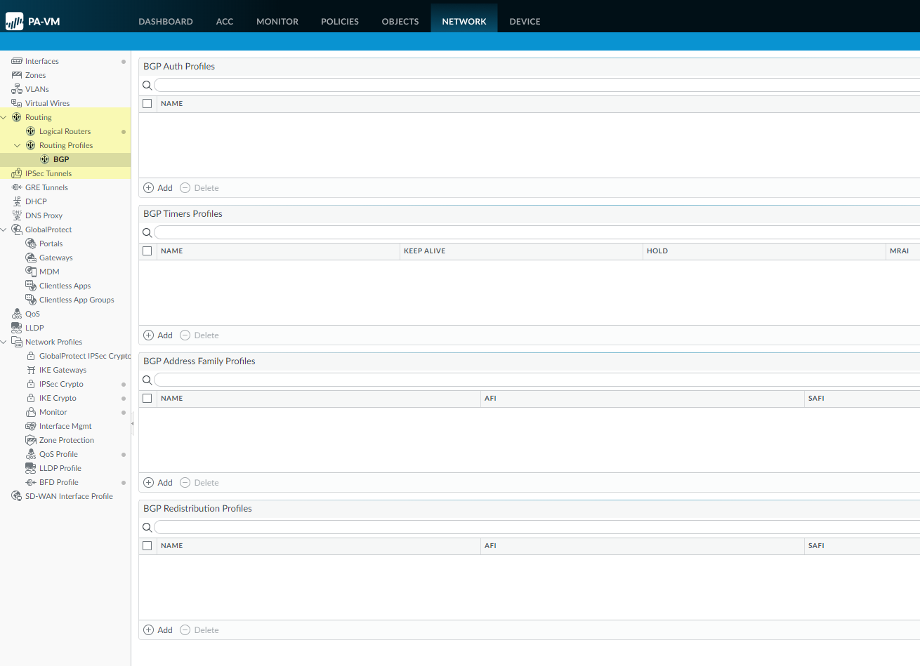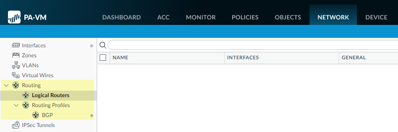 Commit.Select DeviceSetupOperations and Reboot Device.Log back into the firewall.Select Network.Notice the updated menu items, which are more industry-standard and more detailed than the single item (Virtual Routers) on the legacy menu. Routing includes Logical Routers and Routing Profiles, which include BGP. Logical routers in the advanced route engine are equivalent to virtual routers in the legacy route engine.