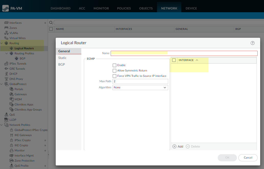 Select Interfaces and configure one or more Layer 3 Interfaces with a static IP address or Configure an Interface as a DHCP Client.Name the logical router and add interfaces to it.- Select NetworkRoutingLogical Routers and Add the Name of the logical router.Add a Layer 3 Interface that you defined to the logical router.