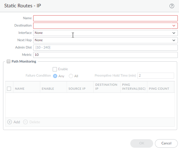 Configure path monitoring for the static route; you can monitor up to 128 static routes.- Select Path Monitoring and Enable.Failure Condition determines whether path monitoring for the static route is based on one (any) or all monitored destinations. Select whether Any or All of the monitored destinations for the static route must be unreachable by ICMP for the firewall to remove the static route from the RIB and FIB and add the static route that has the next lowest metric (going to the same destination) to the FiB.Select All to avoid the possibility of any single monitored destination signaling a route failure when the destination is simply offline for maintenance, for example.(Optional) Specify the Preemptive Hold Time (min), the number of minutes a downed path monitor must remain in Up state before the firewall reinstalls the static route into the RIB; range is 0 to 1,440; default is 2. A setting of 0 (zero) causes the firewall to reinstall the route into the RIB immediately upon the path monitor coming up.The path monitor evaluates all of its monitored destinations for the static route and comes up based on the Any or All failure condition. If a link goes down or flaps during the hold time, when the link comes back up, the path monitor resumes and the Preemptive Hold Time is reset, causing the timer to restart from zero.Add a path monitoring destination by Name.Enable the path monitoring destination.For Source IP, select the IP address that the firewall uses in the ICMP ping to the monitored destination:
