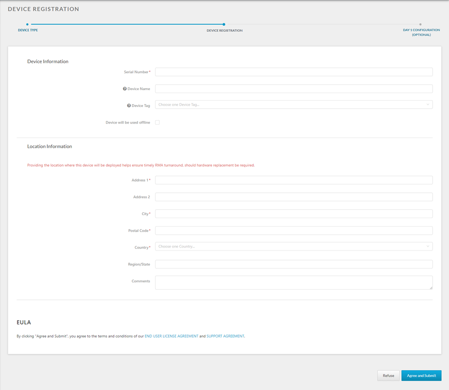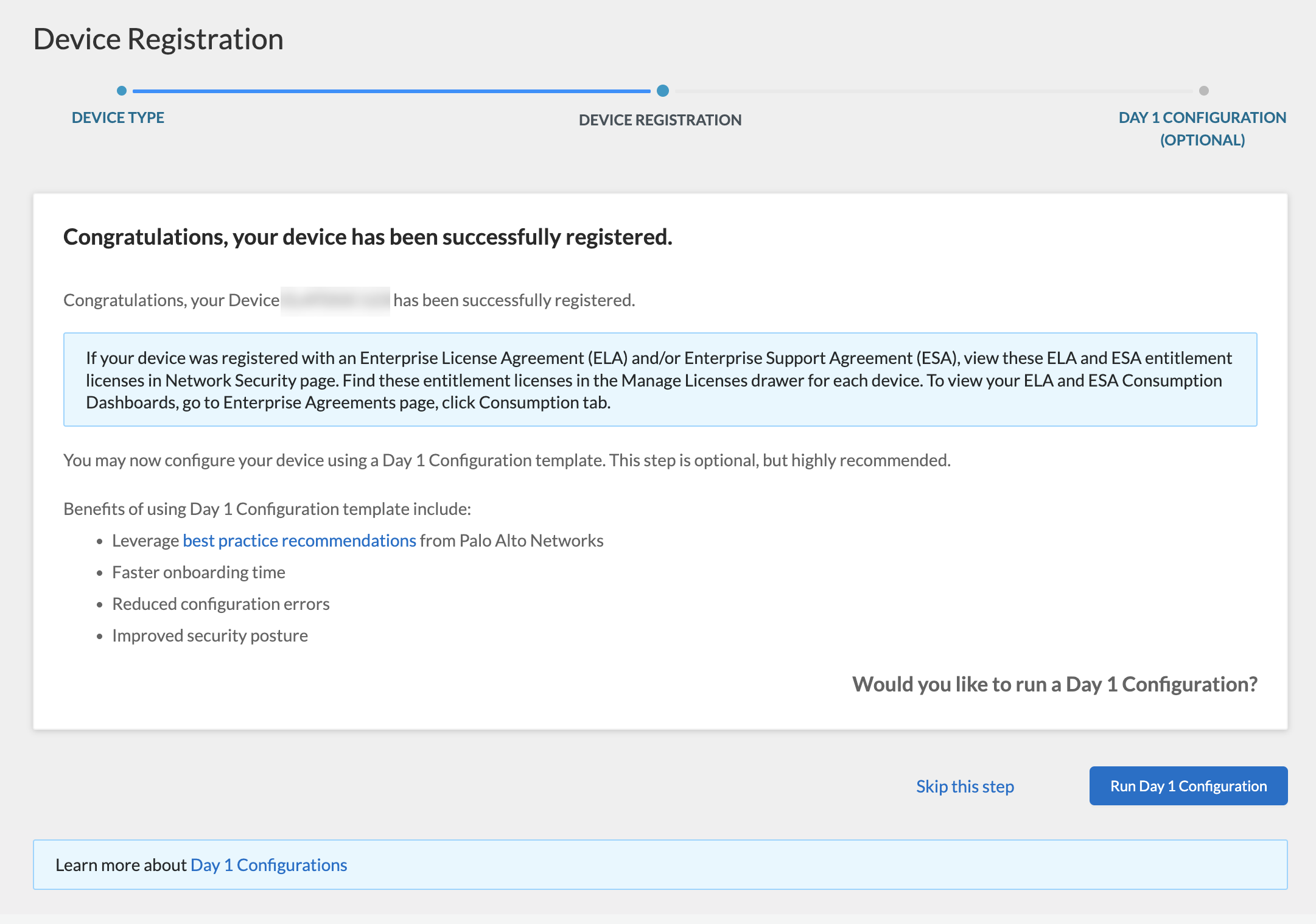 - Go to the Palo Alto Networks Customer Support Portal.Click Create my account.![]() Enter Your Email Address, check I’m not a robot, and click Submit. Enter Your Email Address, check I’m not a robot, and click Submit.![]() Select Register device using Serial Number or Authorization Code and click Next. Select Register device using Serial Number or Authorization Code and click Next.![]() Complete the registration form. Complete the registration form.- Enter your contact details. Required fields are indicated by red asterisks.Create a UserID and Password for the account. Required fields are indicated by red asterisks.Enter the Device Serial Number or Auth Code.Enter your Sales Order Number or Customer Id.To ensure that you are always alerted to the latest updates and security advisories, Subscribe to Content Update Emails, Subscribe to Security Advisories, and Subscribe to Software Update Emails.Select the check box to agree to the End User Agreement and Submit.![]()  Register an NGFWIf you already have an active Palo Alto Networks Customer Support account, perform the following task to register your NGFW.- Log in to the NGFW web interface.Using a secure connection (HTTPS) from your web browser, log in using the new IP address and password you assigned during initial configuration (https://<IP address>).Locate your serial number and copy it to the clipboard.On the Dashboard, locate your Serial Number in the General Information section of the screen.Go to the Palo Alto Networks Customer Support Portal and, if not already logged in, Sign In now.![]() Register the NGFW. Register the NGFW.- On the Support Home page, click Register a Device.![]() Select Register device using Serial Number or Authorization Code, and then click Next. Select Register device using Serial Number or Authorization Code, and then click Next.![]() Enter the NGFW Serial Number (you can copy and paste it from the NGFW Dashboard).(Optional) Enter the Device Name and Device Tag.(Optional) If the device will not have a connection to the internet, select the Device will be used offline check box and then, from the drop-down, select the OS Release you plan to use.Provide information about the physical location where you plan to deploy the NGFW including the Address, City, Postal Code, and Country.The physical location of the NGFW is set on the Customer Support Portal. There is no command on the NGFW to set the physical location.Read the End User License Agreement (EULA) and the Support Agreement, then Agree and Submit. Enter the NGFW Serial Number (you can copy and paste it from the NGFW Dashboard).(Optional) Enter the Device Name and Device Tag.(Optional) If the device will not have a connection to the internet, select the Device will be used offline check box and then, from the drop-down, select the OS Release you plan to use.Provide information about the physical location where you plan to deploy the NGFW including the Address, City, Postal Code, and Country.The physical location of the NGFW is set on the Customer Support Portal. There is no command on the NGFW to set the physical location.Read the End User License Agreement (EULA) and the Support Agreement, then Agree and Submit.![]() You can search for and manage the NGFW you just registered from the Network Security page.(Firewalls with line cards) To ensure that you receive support for your NGFW’s line cards, make sure to register the NGFW line cards. You can search for and manage the NGFW you just registered from the Network Security page.(Firewalls with line cards) To ensure that you receive support for your NGFW’s line cards, make sure to register the NGFW line cards.(Optional) Perform Day 1 ConfigurationAfter you register your NGFW, you have the option of running Day 1 Configuration. The Day 1 Configuration tool provides configuration templates informed by Palo Alto Networks best practices, which you can use as a starting point to build the rest of your configuration.The benefits of Day 1 Configuration templates include:- Faster implementation time