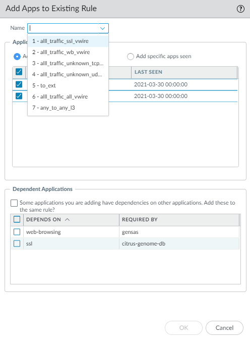 - As with cloning the rule, in some cases, the applications that you want to add to a rule require (depend on) other applications to function. In those cases, the Add Apps to Existing Rule dialog box includes Dependent Applications, where you can select whether to add those applications to the cloned rule. Add the dependent applications to the rule to ensure that the selected applications function properly.