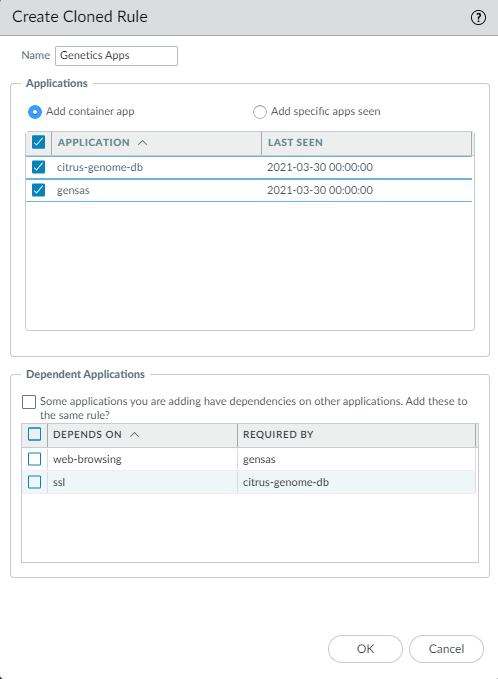 - Select whether to Add container app (default) or only to Add specific apps seen.When you add the container app, you also add all of the functional apps in that container, including functional apps that have not yet been seen on the firewall. For example, if you add the “facebook” container app, that also adds facebook-base, facebook-chat, facebook-posting, etc., and also any future applications added to the container. The container and its functional apps are subject to the Security policy rule that you are cloning. Selecting the container app essentially future-proofs and automates security for the container’s apps so that you don’t have to manually add new apps in that container to your Security policy.Adding only the specific apps seen means that only the applications that you selected are added to the cloned rule. If new applications in the same container app arrive at the firewall, the cloned rule doesn’t control them and you have to manually decide how to handle the new apps.
