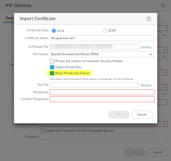 Each of the preceding CLI commands can also include keywords to specify the source, the certificate name, and other parameters that are not shown.If you use the SCP operational CLI command to export a certificate and include its private key (scp export certificate passphrase <phrase> remote-port <1-65536> to <destination> certificate-name <name> include-key <yes | no> format <der | pem | pkcs10 | pkcs12>), and if the certificate’s private key is blocked, the command fails and returns an error message because you cannot export a blocked private key.Verify that you can't export private keys,Import a Private Key for IKE Gateway and Block ItBlock the export of a private key to prevent its misuse after generating a certificate for IKE Gateway authentication.- Select NetworkNetwork ProfilesIKE Gateways.Add a new IKE Gateway.On the General tab, for Authentication, select Certificate.For Local Certificate select Import or Generate depending on whether you want to import an existing certificate or create a certificate.Enter the certificate information. If you are importing the certificate, select Import Private Key to activate the Block Private Key Export checkbox.Select Block Private Key Export to prevent anyone from exporting the key.For importing a certificate, enter and confirm the Passphrase and then click OK![]() For generating a certificate, click Generate. For generating a certificate, click Generate.![]()