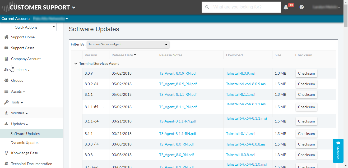 - Log in to the Palo Alto Networks Customer Support Portal.Select UpdatesSoftware Updates.Set Filter By to Terminal Services Agent and select the version of the agent you want to install from the corresponding Download column. For example, to download TS agent 9.0, select TaInstall-9.0.msi.Save the TaInstall.x64-x.x.x-xx.msi or TaInstall-x.x.x-xx.msi file on the systems where you plan to install the agent; be sure to select the appropriate version based on whether the Windows system is running a 32-bit or a 64-bit OS.