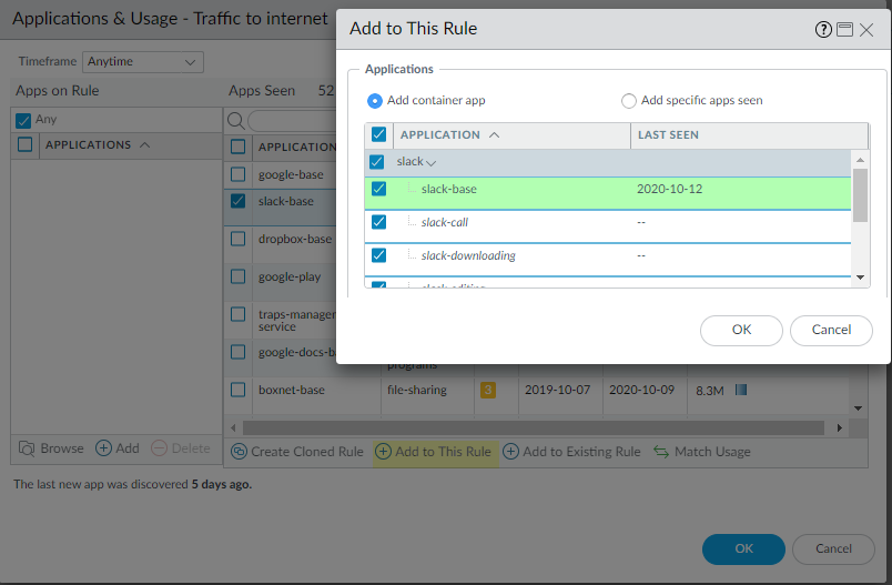 Similar to the Create Cloned Rule dialog, the green text in Add to This Rule is the selected application to add to the rule. The container app (slack) is in the gray row. The applications listed in italics are applications that have not been seen on the rule but are in the same container as the selected application. Individual applications that have been seen on the rule are in normal font. All the applications are included in the cloned rule by default (Add Container App, which adds all the applications in the container, is selected by default) to help prevent the rule from breaking in the future. - If you want to allow all of the applications in the container, leave Add container app selected. This also “future proofs” the rule because when an application is added to the container app, it’s automatically added to the rule.If you want to constrain access to some of the individual applications in the container, uncheck the box next to each individual application you don’t want users to access. This also unchecks the container app, so if you want to allow new applications in the container later, you have to add those applications individually.If you uncheck the container app, all the apps are unchecked and you manually select the apps you want to include in the cloned rule.