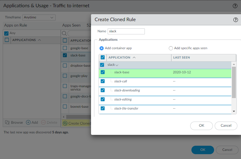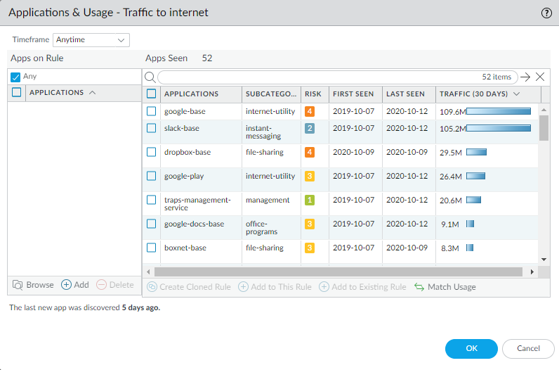 You can check Applications seen on port-based rules over the past 7, 15, or 30 days, or over the rule’s lifetime (Anytime). For migrating rules, Anytime provides the most complete assessment of applications that matched the rule.You can search and filter the Apps Seen, but keep in mind that it takes an hour or more to update Apps Seen. You can also order the Apps Seen by clicking the column headers. For example, you can click Traffic (30 days) to bring the applications with the most recent traffic to the top of the list, or click Subcategory to organize the applications by subcategory.The granularity of measurement for First Seen and Last Seen data is one day, so on the day you define a rule, the dates in these two columns are the same. On the second day the firewall sees traffic on an application, you’ll see a difference in the dates.Clone or add applications to the rule to specify the applications you want to allow on the rule.On Applications & Usage, convert a port-based rule to an application-based rule in either of two ways:- Clone the rule—Preserves the original port-based rule and places the cloned application-based rule directly above it in the rulebase.