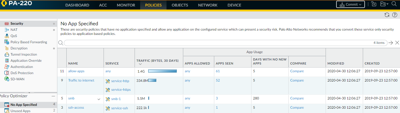 Review the Apps Seen on port-based rules, starting with the highest priority rules.On No Apps Specified, click Compare or the number in Apps Seen to open Applications & Usage, which lists applications that matched a port-based rule over a specified Timeframe, with each application’s Risk, the date it was First Seen, the date it was Last Seen, and the amount of traffic over the last 30 days.