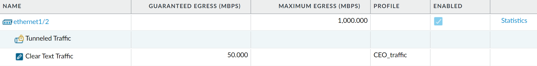 Because the admin wants to ensure that all traffic originating from the CEO is guaranteed by the QoS Profile and associated QoS policy rule he created, he selects the CEO_traffic to apply to Clear Text traffic flowing from Ethernet 1/2.After committing the QoS configuration, the admin navigates to the NetworkQoS page to confirm that the QoS Profile CEO_traffic is enabled on the external-facing interface, Ethernet 1/2: