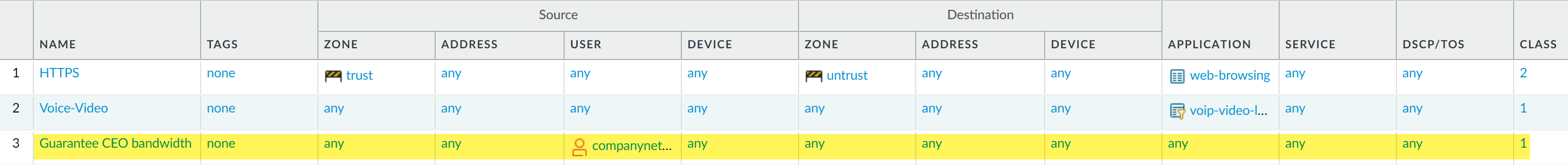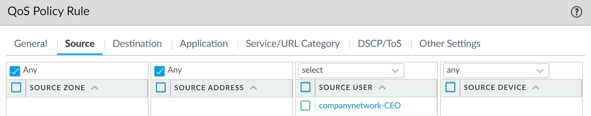 The admin assigns a guaranteed bandwidth (Egress Guaranteed) of 50 Mbps to ensure that the CEO will have that amount that bandwidth guaranteed to her at all times (more than she would need to use), regardless of network congestion.The admin continues by designating Class 1 traffic as high priority and sets the profile’s maximum bandwidth usage (Egress Max) to 1,000 Mbps, the same maximum bandwidth for the interface that the admin will enable QoS on. The admin is choosing to not restrict the CEO’s bandwidth usage in any way.It is a best practice to populate the Egress Max field for a QoS Profile, even if the max bandwidth of the profile matches the max bandwidth of the interface. The QoS Profile’s max bandwidth should never exceed the max bandwidth of the interface you're planning to enable QoS on.The admin creates a QoS policy rule to identify the CEO’s traffic (PoliciesQoS) and assigns it the class that he defined in the QoS Profile (see prior step). Because User-ID is configured, the admin uses the Source tab in the QoS policy rule to singularly identify the CEO’s traffic by her company network username. (If User-ID is not configured, the administrator could Add the CEO’s IP address under Source Address. See User-ID.):