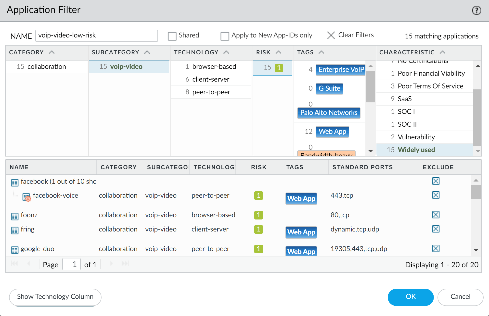 The admin creates a QoS policy rule to identify voice and video traffic. Because the company does not have one standard voice and video application, the admin wants to ensure QoS is applied to a few applications that are widely and regularly used by employees to communicate with other offices, with partners, and with customers. On the PoliciesQoSQoS Policy RuleApplications tab, the admin clicks Add and opens the Application Filter window. The admin continues by selecting criteria to filter the applications he wants to apply QoS to, choosing the Subcategory voip-video, and narrowing that down by specifying only voip-video applications that are both low-risk and widely used.The application filter is a dynamic tool that, when used to filter applications in the QoS policy rule, enables QoS to be applied to all applications that meet the criteria of voip-video, low risk, and widely used at any given time.