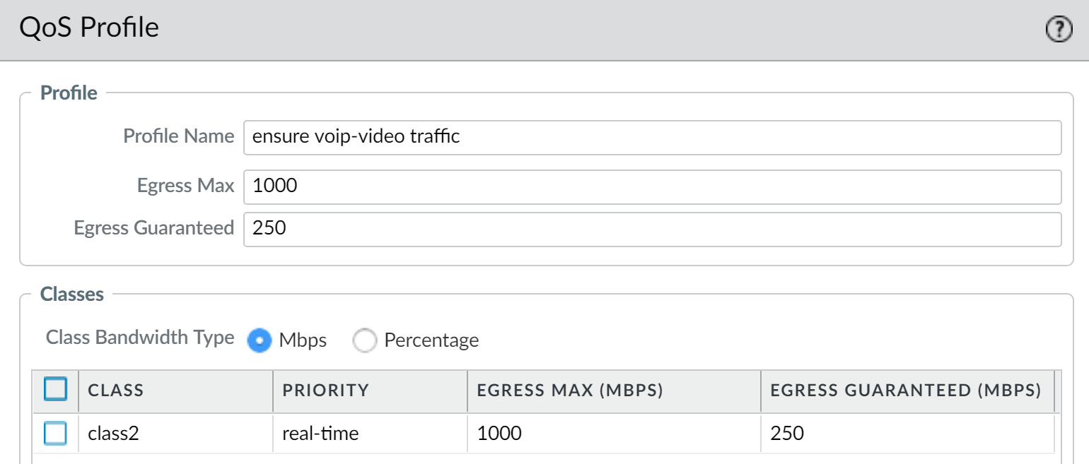 Voice and video traffic is sensitive to measurements that the QoS feature shapes and controls, especially latency and jitter. For voice and video transmissions to be audible and clear, voice and video packets cannot be dropped, delayed, or delivered inconsistently. A best practice for voice and video applications, in addition to guaranteeing bandwidth, is to guarantee priority to voice and video traffic.In this example, employees at a company branch office are experiencing difficulties and unreliability in using video conferencing and Voice over IP (VoIP) technologies to conduct business communications with other branch offices, with partners, and with customers. An IT admin intends to implement QoS to address these issues and ensure effective and reliable business communication for the branch employees. Because the admin wants to guarantee QoS to both incoming and outgoing network traffic, he will enable QoS on both the firewall’s internal- and external-facing interfaces.- The admin creates a QoS Profile, defining Class 2 so that Class 2 traffic receives real-time priority and on an interface with a maximum bandwidth of 1,000 Mbps, is guaranteed a bandwidth of 250 Mbps at all times, including peak periods of network usage.Real-time priority is typically recommended for applications affected by latency, and is useful in guaranteeing performance and quality of voice and video applications.On the firewall web interface, the admin selects the NetworkNetwork ProfilesQoS Profile page, clicks Add, enters the Profile Name, "ensure voip-video traffic", and defines Class 2 traffic.
