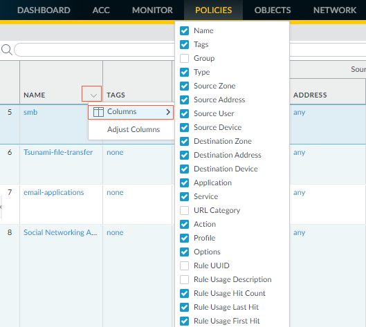 Show/Hide columns | Show or hide the columns that display under Policies.