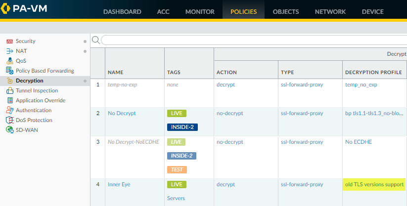 - Scroll to the Profile column of the decryption policy rule. Alternatively, you can select the rule to open it. Then, under Action and Advanced Inspection, find the Decryption Profile.