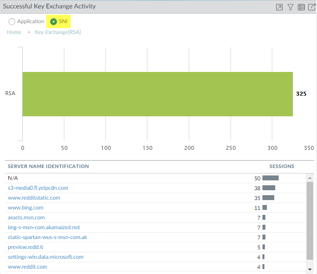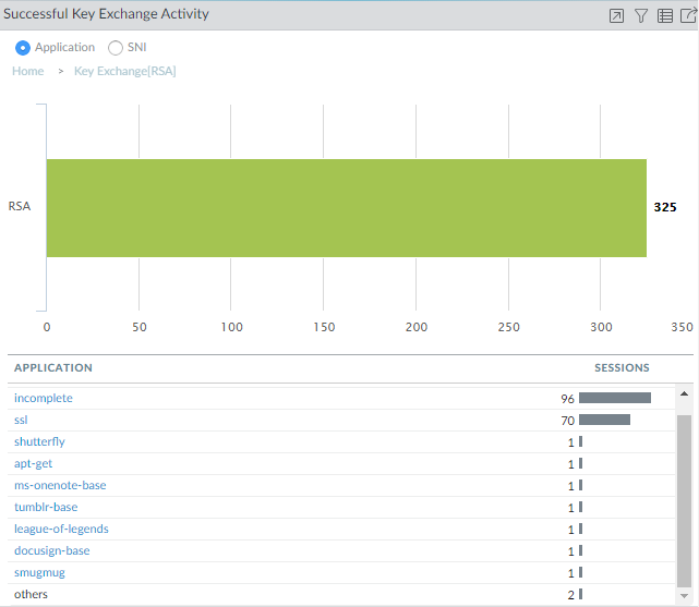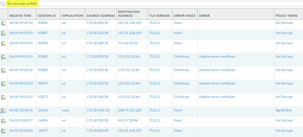 Key Exchange—Identify traffic that uses less secure key exchange algorithms.- Check the Application Command Center (ACC) (ACCSSL ActivitySuccessful Key Exchange Activity) to see which key exchange algorithms the NGFW allows and to get an overall view of activity.![]() The majority of the key exchanges use the secure ECDHE key exchange algorithm. However, some key exchange sessions use the less secure RSA algorithm and a few use another key algorithm. To begin investigating traffic that uses RSA key exchanges, for example, click the number 325 to drill down into the data. The majority of the key exchanges use the secure ECDHE key exchange algorithm. However, some key exchange sessions use the less secure RSA algorithm and a few use another key algorithm. To begin investigating traffic that uses RSA key exchanges, for example, click the number 325 to drill down into the data.![]() The drill-down shows the applications that use RSA key exchanges. We can also click the SNI radio button to view the RSA key exchanges by SNI: The drill-down shows the applications that use RSA key exchanges. We can also click the SNI radio button to view the RSA key exchanges by SNI:![]() Armed with this information, we can go to the logs to gain more context about RSA key exchange usage.Go to the decryption logs (MonitorLogsDecryption)) and filter them for decryption sessions that use the RSA key exchange using the query (tls_keyxchg eq RSA): Armed with this information, we can go to the logs to gain more context about RSA key exchange usage.Go to the decryption logs (MonitorLogsDecryption)) and filter them for decryption sessions that use the RSA key exchange using the query (tls_keyxchg eq RSA):![]() From the Policy Name column in the log, we see that the No Decrypt decryption policy rule controls most of the traffic that uses RSA key exchanges and can infer that the NGFW doesn't decrypt the traffic and allows it without inspection. Because the traffic isn’t decrypted, the NGFW can’t identify the application and lists it as ssl. If you don’t want to allow traffic that uses the RSA key exchange algorithm, modify the decryption profile attached to the decryption policy rule that controls the traffic.You can add to the query to further filter the results for a particular SNI or application that you saw in the ACC or in the first decryption log query.Decide what action to take for traffic that uses less secure key exchange algorithms.Block access to sites that use less secure key exchange protocols unless you need to access them for business purposes. For those sites, consider creating a decryption policy rule and decryption profile that apply only to that site (or to that site and other similar sites) and block all other traffic that uses less secure key exchange algorithms.Use the decryption logs to identify sessions that use older, less secure authentication algorithms.Filter the decryption logs by older, less secure authentication algorithms.For example, to identify all sessions that use the SHA1 algorithm, use the query (tls_auth eq SHA): From the Policy Name column in the log, we see that the No Decrypt decryption policy rule controls most of the traffic that uses RSA key exchanges and can infer that the NGFW doesn't decrypt the traffic and allows it without inspection. Because the traffic isn’t decrypted, the NGFW can’t identify the application and lists it as ssl. If you don’t want to allow traffic that uses the RSA key exchange algorithm, modify the decryption profile attached to the decryption policy rule that controls the traffic.You can add to the query to further filter the results for a particular SNI or application that you saw in the ACC or in the first decryption log query.Decide what action to take for traffic that uses less secure key exchange algorithms.Block access to sites that use less secure key exchange protocols unless you need to access them for business purposes. For those sites, consider creating a decryption policy rule and decryption profile that apply only to that site (or to that site and other similar sites) and block all other traffic that uses less secure key exchange algorithms.Use the decryption logs to identify sessions that use older, less secure authentication algorithms.Filter the decryption logs by older, less secure authentication algorithms.For example, to identify all sessions that use the SHA1 algorithm, use the query (tls_auth eq SHA):![]() You can add to the query to further drill down into the results. For example, you can add a particular SNI, a key exchange version (such as filtering for SHA1 sessions that also use RSA key exchanges), a TLS version, or any other metric found in a decryption log column.Use the decryption logs to identify sessions that use a particular encryption algorithm.For example, to identify all sessions that use the AES-128-CBC encryption algorithm, use the query (tls_enc eq AES_128_CBC): You can add to the query to further drill down into the results. For example, you can add a particular SNI, a key exchange version (such as filtering for SHA1 sessions that also use RSA key exchanges), a TLS version, or any other metric found in a decryption log column.Use the decryption logs to identify sessions that use a particular encryption algorithm.For example, to identify all sessions that use the AES-128-CBC encryption algorithm, use the query (tls_enc eq AES_128_CBC):![]() You can add to the query to further drill down into the results.Examples of queries to find other older encryption algorithms include: (tls_enc eq DES_CBC), (tls_enc eq 3DES_EDE_CBC), and (tls_enc eq DES40_CBC).Use this methodology and the log filter builder to create queries to investigate negotiated ECC curves and any other information you find in the decryption logs. You can add to the query to further drill down into the results.Examples of queries to find other older encryption algorithms include: (tls_enc eq DES_CBC), (tls_enc eq 3DES_EDE_CBC), and (tls_enc 