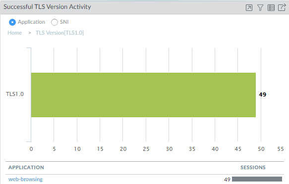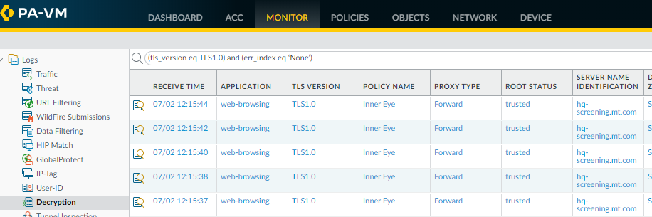 - Filter decryption logs to check TLSv1.0 activity details.Decryption logs show successful TLS activity only if you select the Log Successful TLS Handshakes option in a decryption policy rule. If this option is disabled, you can’t see this information.- Select Log Viewer, and then select Firewall/Decryption.Use the query (TLS Version = 'TLS1.0') AND (Error Index = 'None') to show successful TLSv1.0 decryption sessions.The decryption logs show us that the name of the decryption policy rule that controls the traffic. Now, we know the site that uses TLSv1.0 and can check the decryption policy rule to find the decryption profile that controls the traffic and learn why the traffic is allowed.Find the decryption profile that controls the traffic to learn why the traffic is allowed.- Select Configuration NGFW and Prisma Access Security Services Decryption, and search for the decryption policy rule you identified earlier.