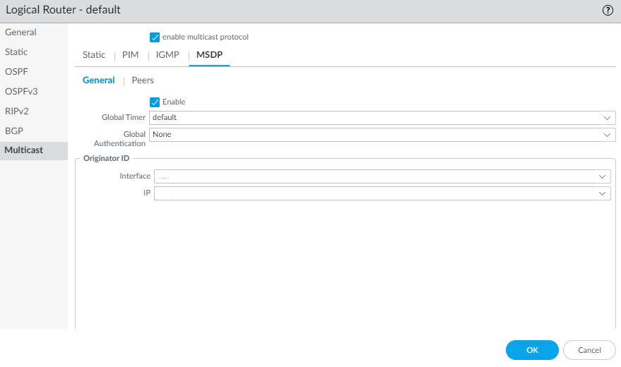 - Configure a Logical Router.Select NetworkRoutingLogical Routers and select a logical router.Select Multicast and enable multicast protocol.Select MSDPGeneral and Enable MSDP.Select the Global Timer profile, or select the default profile (this is the default setting), or create a new timer profile. If you select default, Keep Alive Interval is set to 60, Message Timeout is set to 75, and Connection Retry Interval is set to 30. If you select None, the default values apply.Select the Global Authentication profile or create a new one. Default is None.For the Originator ID, select the Interface that the logical router uses as the RP interface in Source-Active (SA) messages.Select or enter the IP Address (with prefix length) that the logical router uses as the RP address in SA messages. If no Originator IP address is configured, the logical router uses the PIM RP address to encapsulate the SA message.
