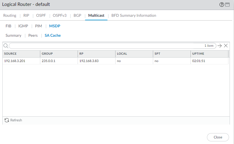 For Max SA, enter the maximum number of Source-Active (SA) entries the SA cache will accept from this MSDP peer. Range is 0 to 1,024; default is 0 (unlimited). After this maximum is reached, new SA messages from this peer are dropped.For Peer Inbound SA Filter, select an access list or create a new access list to filter incoming SA messages (block unwanted groups) from this peer. Default is None.The access list can specify source addresses in an (S,G) pair to filter, or destination (group) addresses in an (S,G) pair to filter, or both.For Peer Outbound SA Filter, select an access list or create a new access list to filter outgoing SA messages (block unwanted groups) being propagated to this peer. Default is None.The access list can specify source addresses in an (S,G) to filter, or destination (group) addresses in an (S,G) to filter, or both.Click OK.Create MSDP authentication and timer profiles if you haven’t done so.Commit.View MSDP information.- Select NetworkRoutingLogical Routers and in the row for the logical router you configured, select More Runtime Stats.Select MulticastMSDPSummary to see general MSDP information, such as originator IP address, timers, authentication, and peer name.