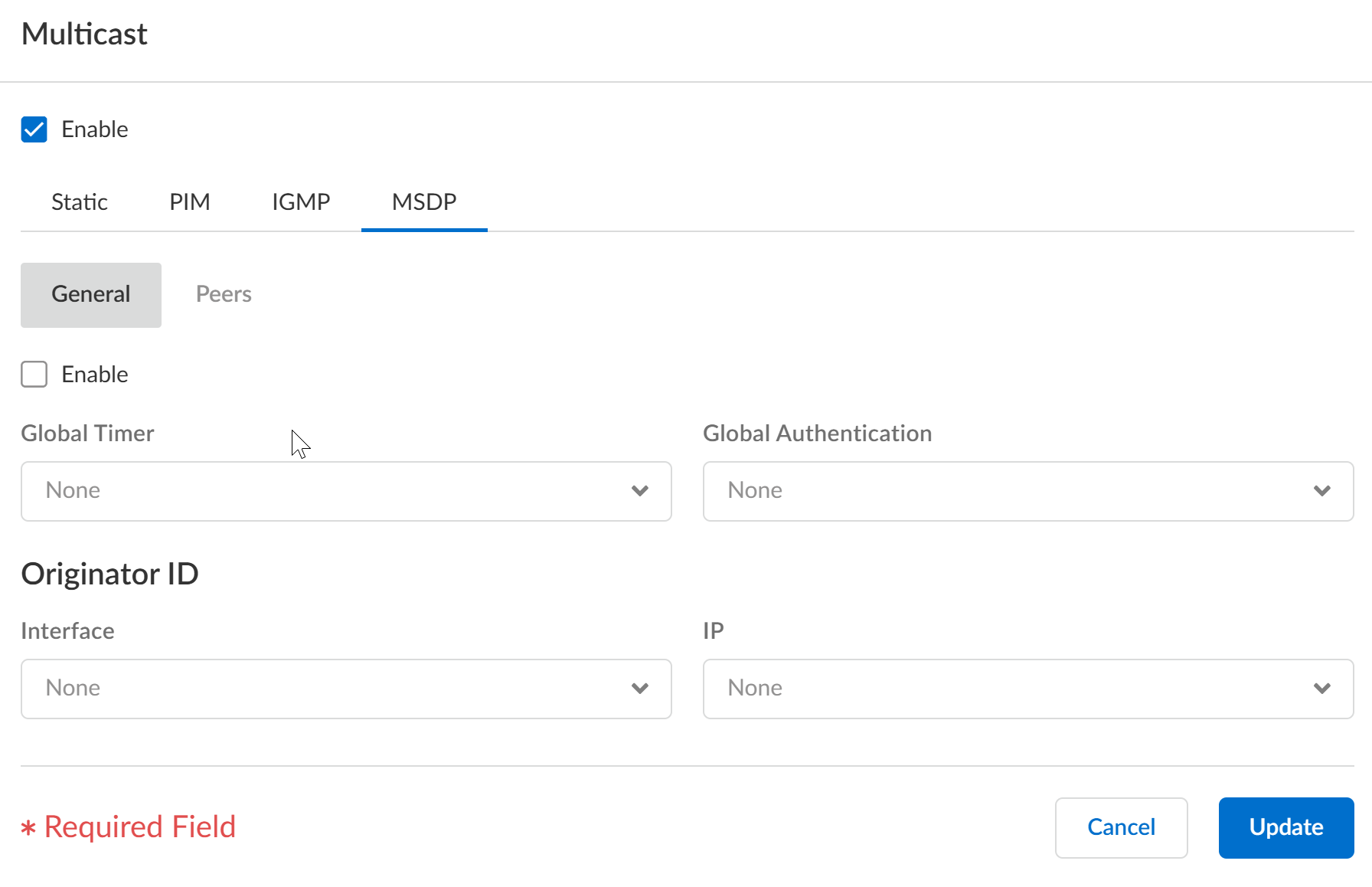 Select the Global Timer profile, or select the default profile (this is the default setting), or create a new timer profile. If you select default, Keep Alive Interval is set to 60, Message Timeout is set to 75, and Connection Retry Interval is set to 30. If you select None, the default values apply.Select the Global Authentication profile or create a new one. The default is None.For the Originator ID, select the Interface that the logical router uses as the RP interface in Source-Active (SA) messages.Select or enter the IP Address (with prefix length) that the logical router uses as the RP address in SA messages. If no Originator IP address is configured, the logical router uses the PIM RP address to encapsulate the SA message.Select the Peers tab and Add a peer Name (maximum of 63 characters). The name must start with an alphanumeric character, underscore (_), hyphen (-), or dot (.) and can contain a combination of alphanumeric characters, underscore, or hyphen or dot. No space is allowed.