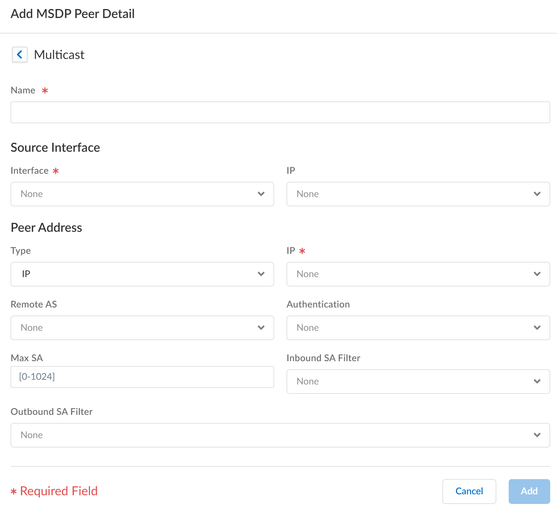 Enter the Source Interface used to establish the MSDP connection over TCP with its MSDP peer.Select the IP address of the source interface. The default is None.Select the Type of peer address:- IP—(the default) and select an address object or enter an IP address.