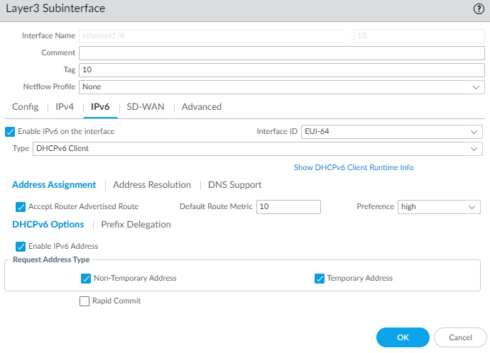 Enter a Default Route Metric for the route from the interface to the ISP; range is 1 to 65,535; default is 10.Select Preference of the DHCPv6 client interface (low, medium or high) so that, in the event you have two interfaces (each connected to a different ISP for redundancy), you can assign the interface to one ISP a higher preference than the interface to the other ISP. The ISP connected to the preferred interface will be the ISP that provides the delegated prefix to send to a host-facing interface. If the interfaces have the same preference, both ISPs provide a delegated prefix and the host decides which prefix to use.Select DHCPv6 Options and Enable IPv6 Address.In the Request Address Type area, select Non-Temporary Address (default setting). This address type has a longer lifespan.Select Temporary Address for a greater level of security because the address is intended to be used for a short period of time.Whether you request a Non-Temporary Address or Temporary Address for the interface is based on your discretion and the capability of the DHCPv6 server; some servers can provide only a temporary address. The best practice is to select both Non-Temporary Address and Temporary Address, in which case the firewall will prefer the Non-Temporary Address.Select Rapid Commit to use the DHCPv6 process of Solicit and Reply messages (two messages), rather than the process of Solicit, Advertise, Request, and Reply messages (four messages).Select Prefix Delegation and Enable Prefix Delegation to allow the firewall to support prefix delegation functionality. This means that the interface accepts a prefix from the upstream DHCPv6 server and places the prefix into the Prefix Pool, from which the firewall delegates a prefix to a host via RA. The ability to enable or disable prefix delegation for an interface allows the firewall to support multiple ISPs (one ISP per interface). Enabling prefix delegation on this interface controls which ISP provides the prefix.The delegated prefix is used on the host-facing interface, and its IPv6 address is constructed with the MAC address and EUI-64 input. In our example, the inherited interface receives the inherited prefix displayed in the step to view DHCPv6 information.