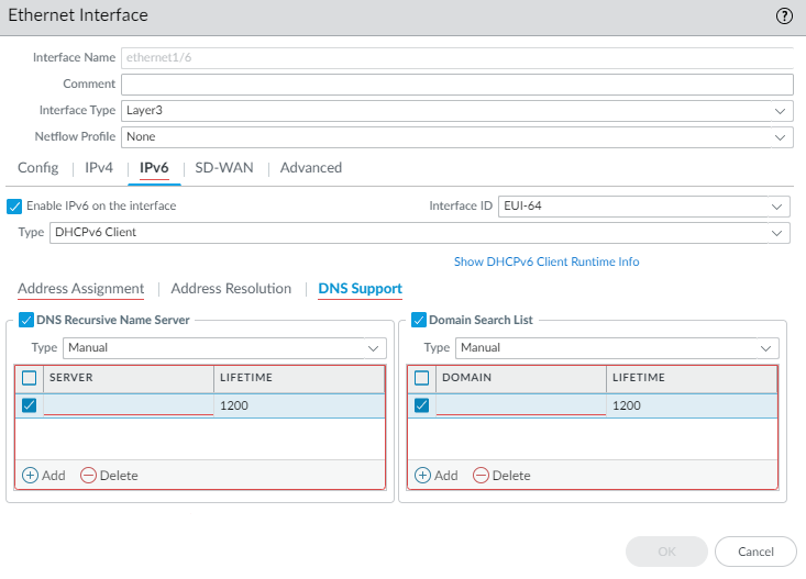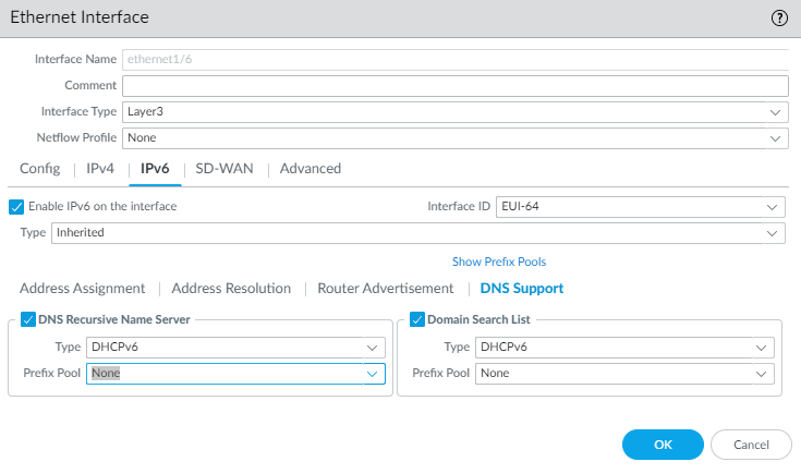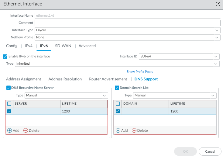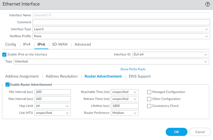 Set the Min Interval (sec), the minimum interval, in seconds, between RAs the firewall sends (range is 3 to 1,350; default is 200). The firewall sends RAs at random intervals between the minimum and maximum values you set.Set Max Interval (sec), the maximum interval, in seconds between RAs the firewall sends (range is 4 to 1,800; default is 600). The firewall sends RAs at random intervals between the minimum and maximum values you set.Set Hop Limit to apply to clients for outgoing packets (range is 1 to 255; default is 64). Select unspecified to use the system default.Set Link MTU, the link maximum transmission unit (MTU) to apply to clients (range is 1,280 to 9,216; default is unspecified, which means the system default.Set Reachable Time (ms), in milliseconds, that the client will use to assume a neighbor is reachable after receiving a Reachability Confirmation message (range is 0 to 3,600,000; default is unspecified).Set Retrans Timer (ms), the retransmission timer that determines how long the client will wait, in milliseconds, before retransmitting Neighbor Solicitation messages. Select unspecified for no retransmission time (range is 0 to 4,294,967,295; default is unspecified).Set Lifetime (sec) to specify how long, in seconds, the client will use the firewall as the default gateway (range is 0 to 9,000; default is 1,800). Zero specifies that the firewall is not the default gateway. When the lifetime expires, the client removes the firewall entry from its Default Router List and uses another router as the default gateway.Set Router Preference in case there are two or more inherited interfaces on different routers sending RAs to a host. High, Medium, or Low is the priority that the RA advertises indicating the relative priority and the host uses the prefix from the higher prioritized router.Select Managed Configuration to indicate to the client that addresses are available via DHCPv6.Select Other Configuration to indicate to the client that other address information (such as DNS-related settings) is available via DHCPv6.Select Consistency Check to have the firewall verify that RAs sent from other routers are advertising consistent information on the link. The firewall logs any inconsistencies.For Inherited interface, configure DNS Support.- Select DNS Support.Enable DNS Recursive Name Server and select DHCPv6 or Manual: