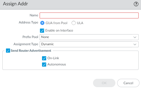 Select Send Router Advertisement to send RAs from the inherited interface to the LAN hosts.If you chose ULA, enter a Valid Lifetime and Preferred Lifetime.Select On-Link if systems that have addresses within the prefix are reachable without a router.Select Autonomous if systems can independently create an IPv6 address by combining the advertised prefix with an Interface ID.Click OK to save address assignment.For Inherited interface, configure address resolution.- Select Address Resolution.