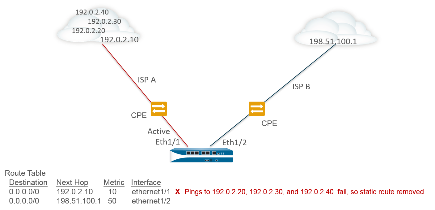 - If pings to any or all of the monitored destinations fail, the firewall considers the static route down too and removes it from the Routing Information Base (RIB) and Forwarding Information Base (FIB). The RIB is the table of static routes the firewall is configured with and dynamic routes it has learned from routing protocols. The FIB is the forwarding table of routes the firewall uses for forwarding packets. The firewall selects an alternative static route to the same destination (based on the route with the lowest metric) from the RIB and places it in the FIB.