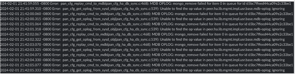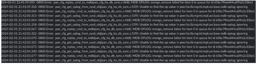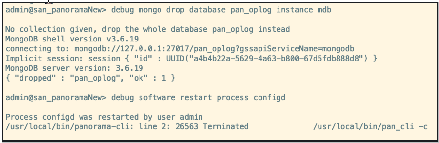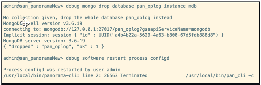 admin > debug mongo drop database pan_oplog instance mdb - (In administrator mode) Restart configd on both the