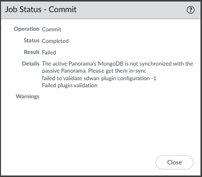 Once the configd is restarted, refresh the respective web interface and command line interface. After restart, you won't be seeing the mongo pan_oplog error on any of the commit processes.We recommend you to monitor the configd logs during the whole upgrade process.Download and install the SD-WAN plugin version 2.2.7 on both active and passive Panorama.(Mandatory) (In configuration mode) Commit the changes from the active Panorama.Monitor the HA synchronization job on the passive Panorama HA peer. If you encounter the following error message, then execute debug plugins sd_wan mongo-db sync-db-to-peer CLI command from the active Panorama HA peer manually.