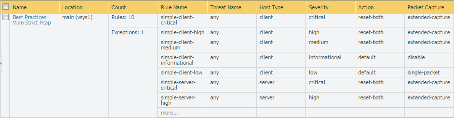 - Attach a best practice Vulnerability Protection profile to the security policy rules that allow access in to your management network to protect against buffer overflows, illegal code execution, and other attempts to exploit client- and server-side vulnerabilities. To create a profile for the purpose of protecting your management interface, clone the strict profile and then enable extended packet capture to help you track down the source of any potential attacks.