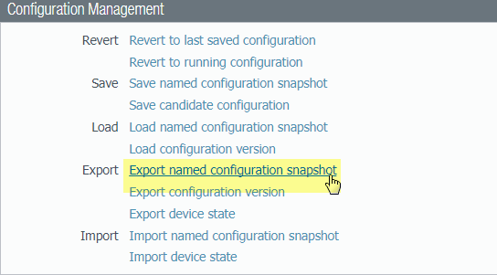 - Save a backup of the current configuration file.Although the firewall automatically creates a backup of the configuration, it is a best practice to create and externally store a backup before you upgrade.Perform these steps on each firewall in the pair:- Select DeviceSetupOperations and