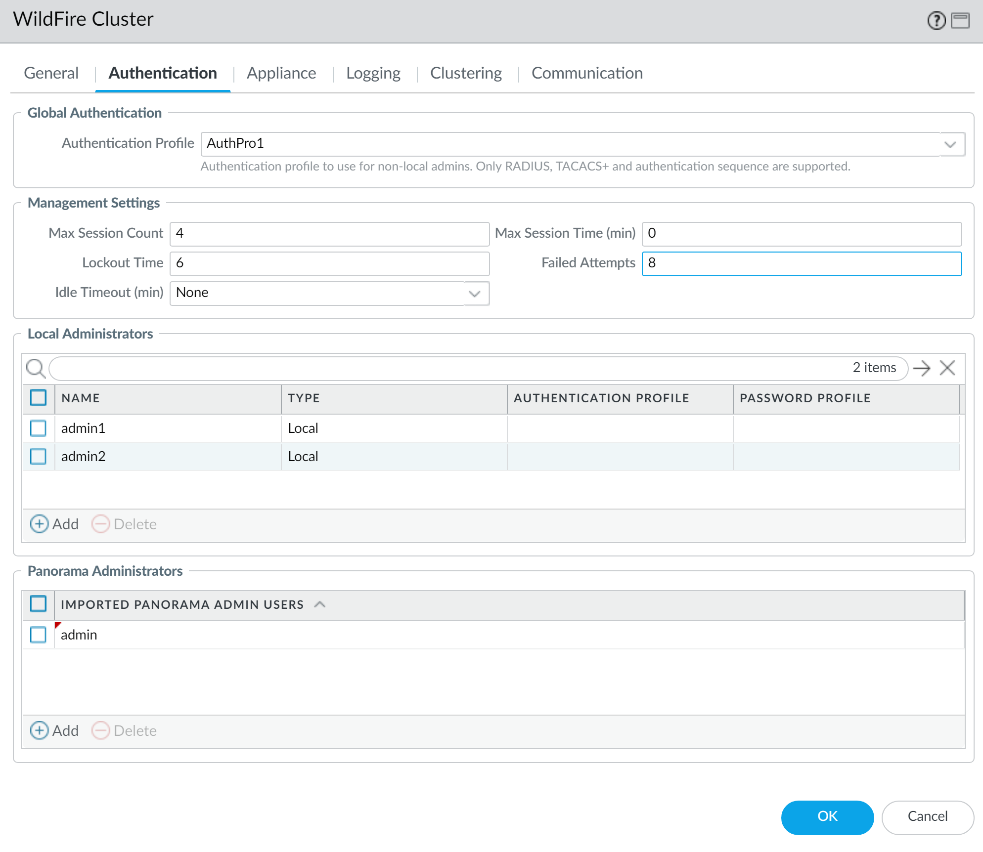 - Add any administrators configured on Panorama. These administrators are created on Panorama and imported to the WildFire appliances in the WildFire cluster.