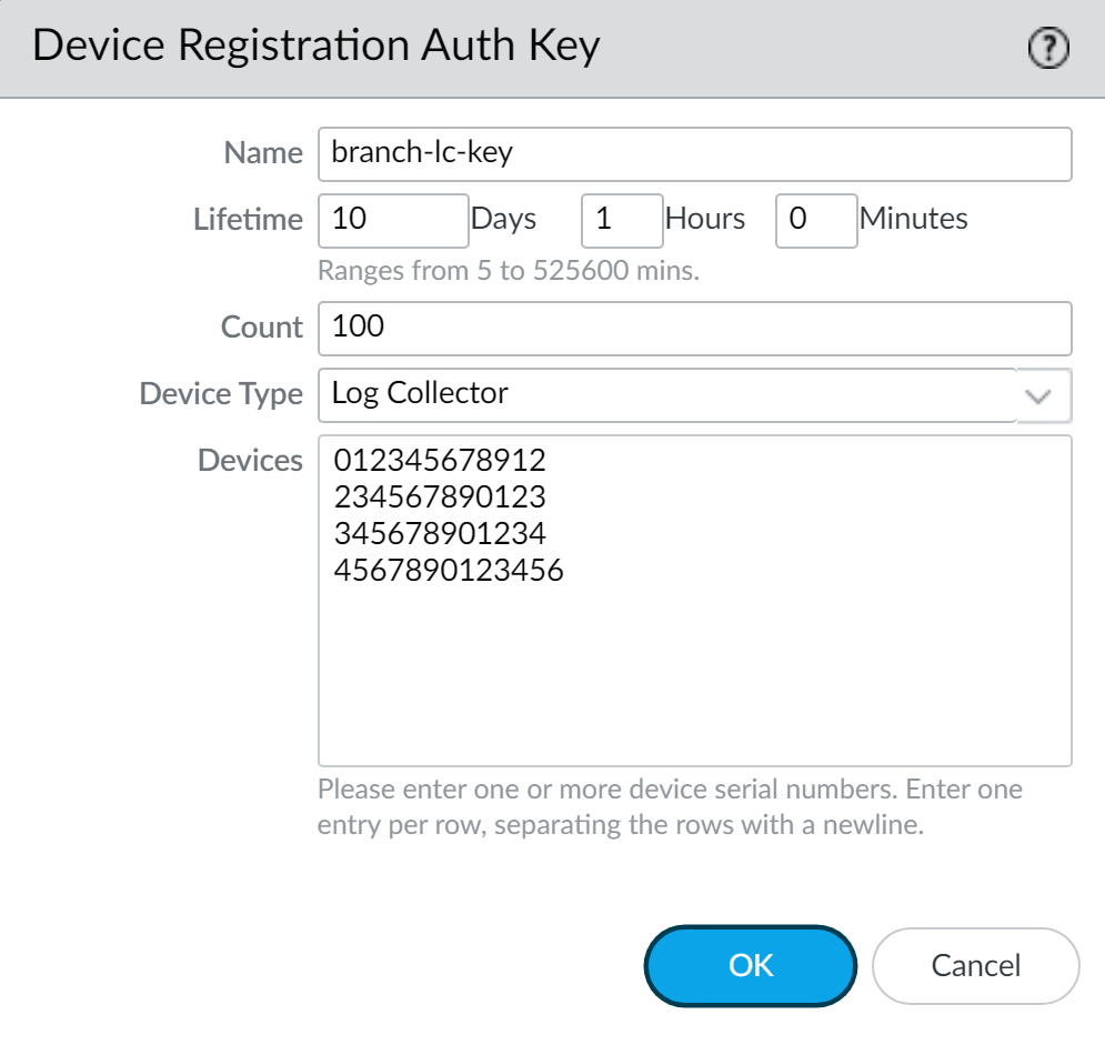 - (Optional) Devices—Enter one or more device serial numbers to specify for which Log Collectors the authentication key is valid.