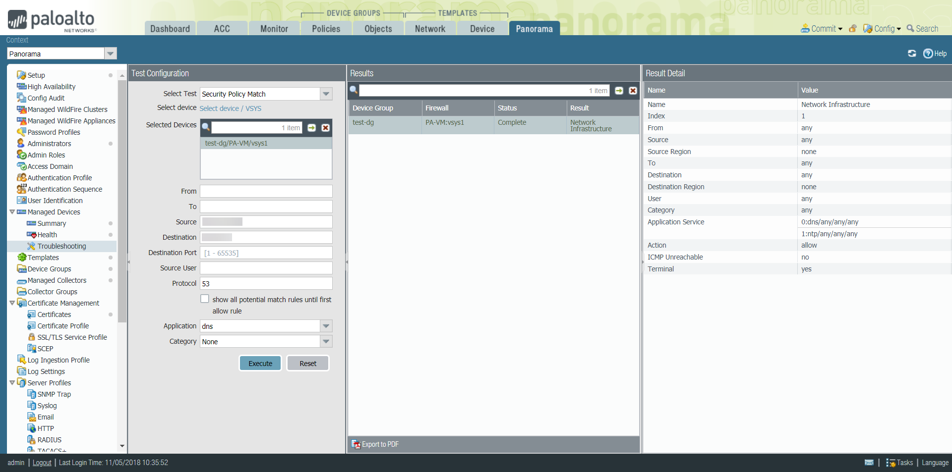 match test. In this example, a Security policy match test is run.- Select Security Policy Match from the Select Test drop-down.
