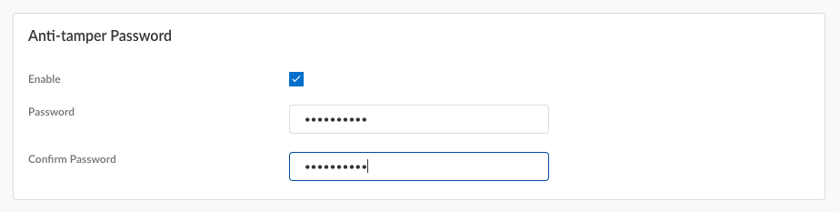 - Enter the anti-tamper unlock Password and Confirm Password. The password must have a minimum of eight alphanumeric characters. If you enable the anti-tamper feature but don’t provide an anti-tamper unlock password, the push configuration will fail.