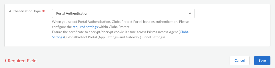 Ensure that the certificate used to encrypt and decrypt the authentication override cookie is the same across the Prisma Access Agent global app settings, GlobalProtect Portal, and GlobalProtect gateway.