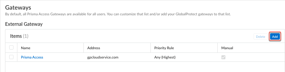 If you need to create or update an app configuration rule, follow the instructions in Configure Agent Settings for the Prisma Access Agent. Otherwise, go to the next step.To add an External Gateway to which your users can connect:- Click Add.