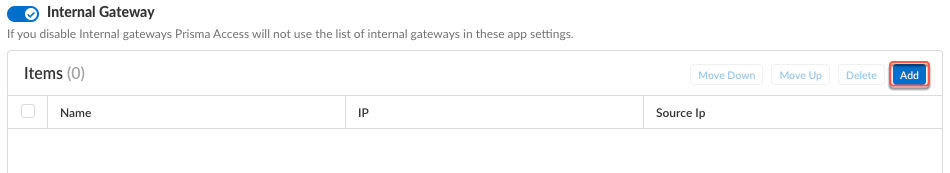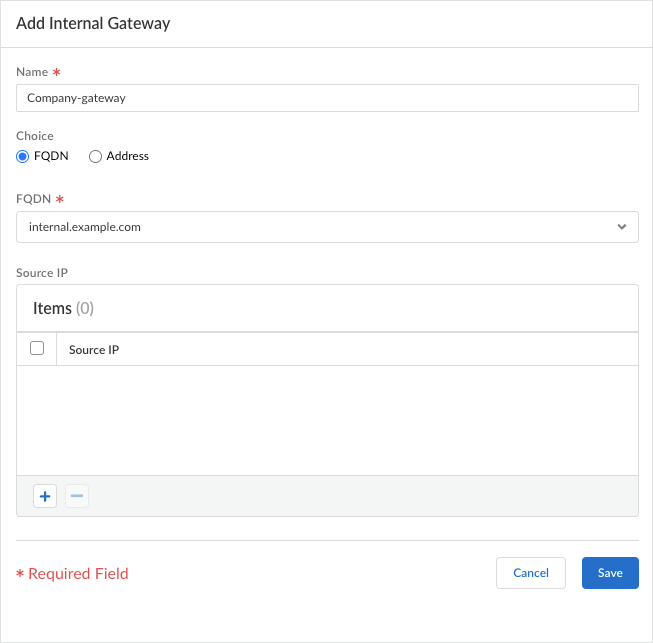 Enter a descriptive Name for the gateway. The name you enter here should match the name you defined when you configured the gateway and should be descriptive enough for users to know the location of the gateway they are connected to.For Panorama Managed Prisma Access, you can only select a gateway that's already configured in Panorama.Enter the FQDN or IP address of the interface where the gateway is configured.You can configure an IPv4. The address you specify must exactly match the Common Name (CN) in the gateway server certificate.For Panorama Managed Prisma Access, this FQDN and IP values are inherited from Panorama. You cannot update them.(Optional) Click the + sign to add one or more Source IP to the gateway configuration. The source IP address can be an IP subnet, range, or predefined address. The Prisma Access Agent supports IPv4 addresses. When users connect, the Prisma Access Agent recognizes the source address of the endpoint, and only allows users to connect to gateways that are configured for that address.Save your settings.For Panorama Managed Prisma Access, Update your settings.