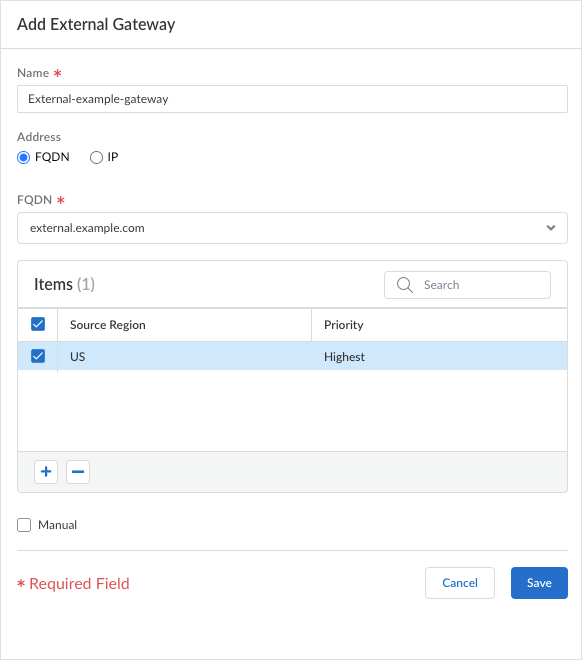Enter a descriptive Name for the gateway. The name you enter here should match the name you defined when you configured the gateway and should be descriptive enough for users to know the location of the gateway they are connected to.For Panorama Managed Prisma Access, you can only select a gateway that's already configured in Panorama.Enter the FQDN or IP address of the interface where the gateway is configured.You can configure an IPv4. The address you specify must exactly match the Common Name (CN) in the gateway server certificate.For Panorama Managed Prisma Access, this FQDN and IP values are inherited from Panorama. You cannot update them.Click the + sign to add one or more Source Regions for the gateway, or select Any to make the gateway available to all regions. When users connect, the Prisma Access Agent recognizes the region, and only allows users to connect to gateways that are configured for that region. For gateway selection, the source region is considered first, then gateway priority.Set the Priority of the gateway by clicking the field and selecting one of the following values:- If you have only one external gateway, leave the value as Highest (the default).
