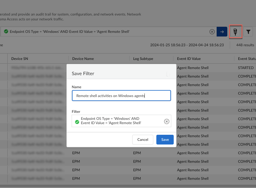 You can create a query for Prisma Access management logs using the information in Endpoint Logs.Select an operator, such as =, !=, < >, or LIKE and a value for the field. You can build on the query by adding AND or OR operators. For example, to audit the remote shell activities that were initiated on Windows endpoints from ConfigurationEndpoint Management, you can create a query such as:Endpoint OS Type = 'Windows' AND Event ID Value = 'Agent Remote Shell'
