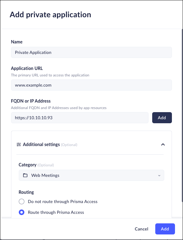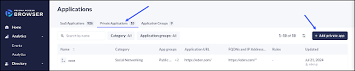 Private applications are applications that your enterprise manages internally. The application remains in your data center, and is only accessible by internal users who have the appropriate permissions.The Prisma Access Browser handles these applications separately from custom applications. Private applications require that you configure the FQDN and additional IP addresses that are required for using the application.You can configure access to a wider set of private apps by using wildcards.Wildcards are supported only at the beginning of subdomains.For example: *.example.com or *.shop.example.com- From Strata Cloud Manager, ManageConfigurationPrisma Access Browser DirectoryApplications.On the Application screen, click Private Applications and then Add private app.