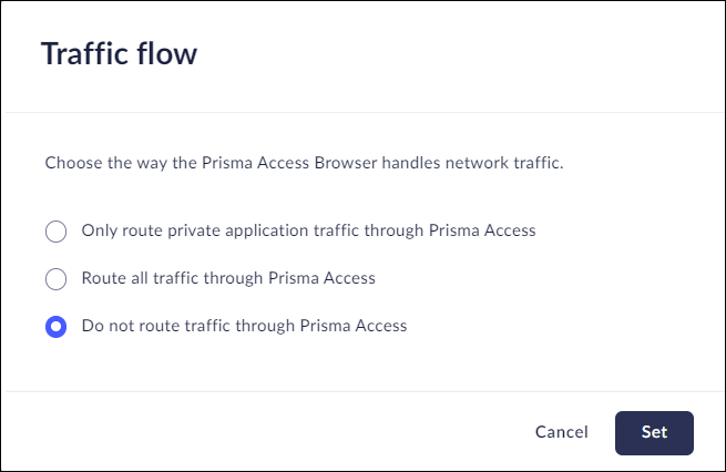 Click Set.![]()  Traffic FlowMobile Browser - Partial supportThe Traffic Flow control allows you to manage the way that the Prisma Access Browser handles network traffic.- From Strata Cloud Manager, select ConfigurationPrisma Access Browser PolicyProfilesBrowser CustomizationSelect Traffic Flow.Select one of the following options:- Only route private application traffic through Prisma Access.