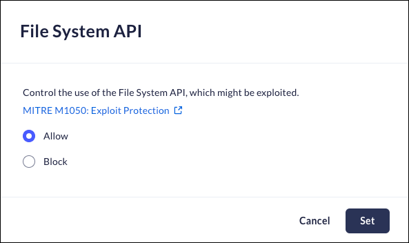 Mobile Browser - No supportThe File System Access API (formerly known as the Native File System API and Writable Files API) enables developers to build powerful web apps that interact with files on the user's local device, such as IDEs, photos, video editors, text editors, and more. After a user grants a web app access, this API allows them to read or save changes directly to files and folders on the user's device. Beyond reading and writing files, the File System Access API allows opening a directory and enumerating its contents.This anti-exploitation policy controls the use of the File System API, which can be potentially exploited.Note: Disabling File System API may impact different websites using it in a legitimate way.When a user attempts to access a domain that is blocked, they will receive an on-screen notification, and a Log event will be created.- From Strata Cloud Manager, select ConfigurationPrisma Access Browser PolicyProfilesBrowser SecuritySelect File System API.Select one of the following options: