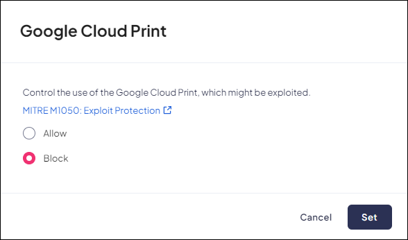 Mobile Browser - No supportGoogle Cloud Print is a discontinued Google service that allows users to print from any Cloud Print-aware application (web, desktop, mobile) on any device in the network cloud to any printer with native support for connecting to Cloud Print services.This anti-exploitation policy controls the use of the Google Cloud Print API, which can be potentially exploited.- From Strata Cloud Manager, select ConfigurationPrisma Access Browser PolicyProfilesBrowser SecuritySelect Google Cloud Print.Select one of the following options: